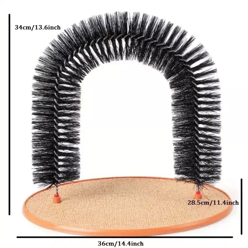 A escova em formato de arco envolve o corpo do gato e alcança facilmente regiões onde ele não consegue lamber — como pescoço, laterais e costas.